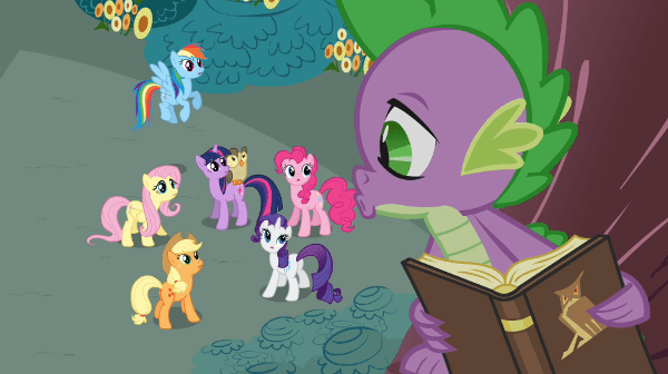 I get the feeling that was probably meant to be the key at the heart of this episode – if only Twilight had taken the time to spell out her feelings, instead of just assuming Spike knew how valued and loved he was, and how irrational his fears were! – but it’s undermined, because the episode just keeps piling up Spike’s resentment and jealousy higher and higher without ever flat-out confronting either Twilight or Owlowiscious about it.